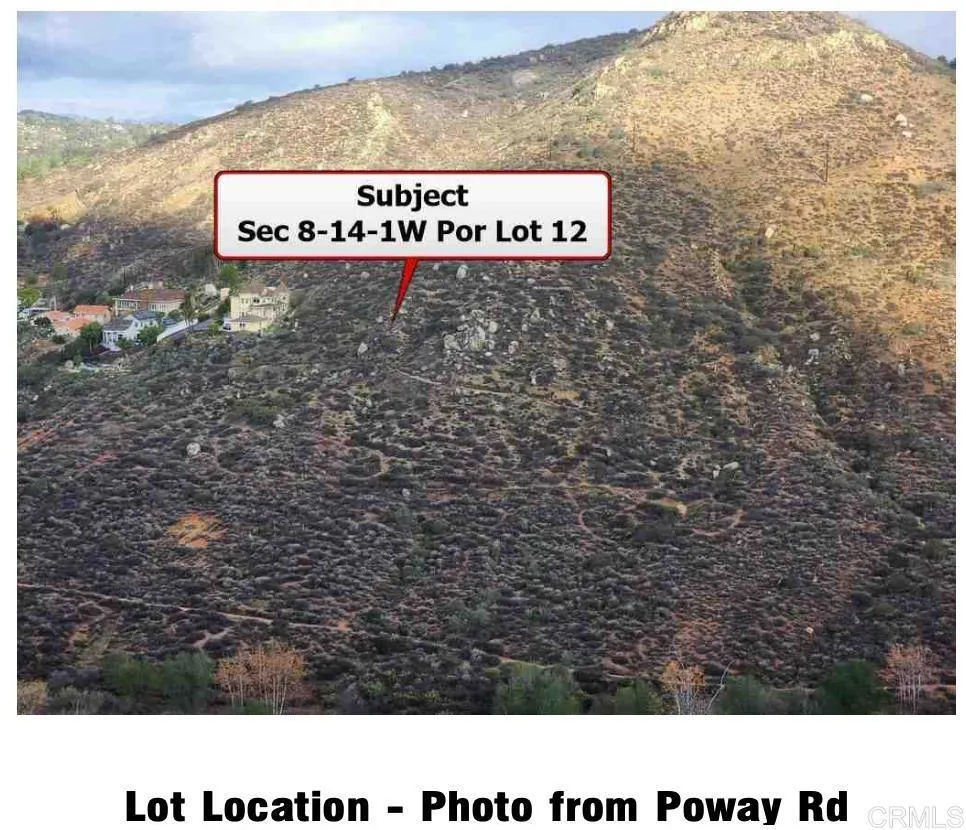 Price Improvement! Enjoy private, scenic, and peaceful! Hills and Mountain views! Just over an acre vacant land in Poway located minutes from schools, shopping and all that Poway has to offer! Great investment property for future development. It is just north of Poway Road, the main road leading into the town and close to the I-15. Lot is a little off the beaten path. Lot Survey has been completed by Seller. This parcel is also available for sale along with another vacant Lot 26 MLS #PTP2508868.