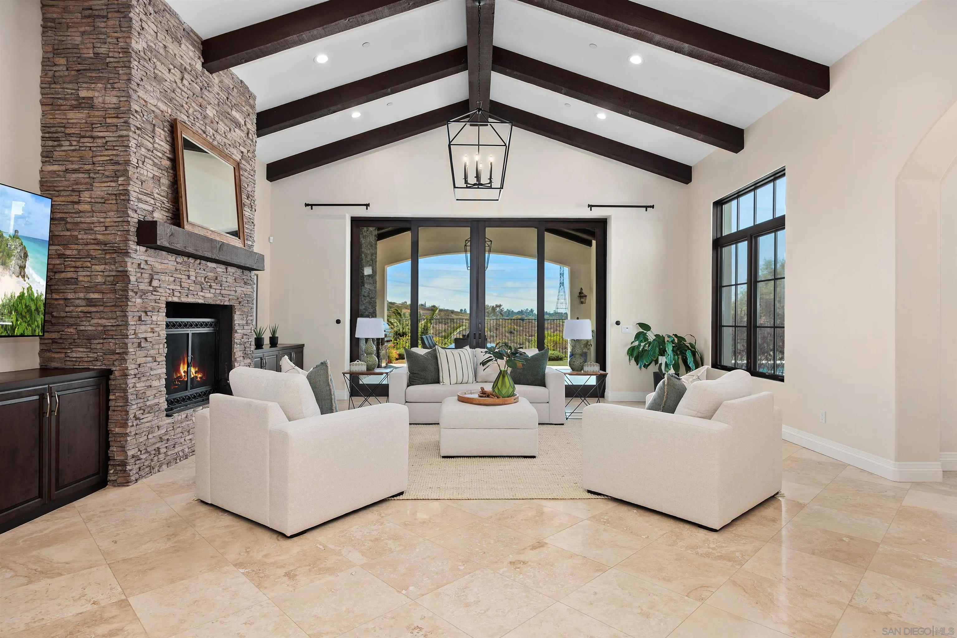 This absolutely stunning custom estate in The Crosby at Rancho Santa Fe was completed in 2022, making it one of the newest homes in this prestigious community! Located within the top-rated Solana Santa Fe (K–8) and Torrey Pines High School districts, near premier private academies. Designed by renowned local architect Scott Grunst, the home is situated on a quiet, beautiful street lined with luxury residences. The 6,523 sq. ft. residence offers timeless elegance and modern luxury. A grand 22-ft foyer welcomes you with soaring arched windows, hardwood floors, exposed solid wood beams, and a dramatic staircase with wrought iron railings. The chef’s kitchen features an eight burner Wolf range with an infrared charbroiler, 64″ Electrolux fridge/freezer combo, and double Electrolux dishwashers, while the wet bar has a built-in kegerator. Wine lovers will appreciate the custom, temperature and humidity-controlled 800-bottle wine cellar with additional storage space. The house has Brazilian quartzite countertops and custom-built stained alder wood cabinetry throughout. Enjoy seamless indoor-outdoor living with disappearing pocket sliding doors that open the main living room to a covered loggia with full outdoor kitchen, fireplace, and Wolf BBQ. The resort-style backyard is very private and boasts a rim flow PebbleTec® coated pool, vanishing-edge spa, raised fire pits, and unobstructed sunset views over a protected natural preserve.