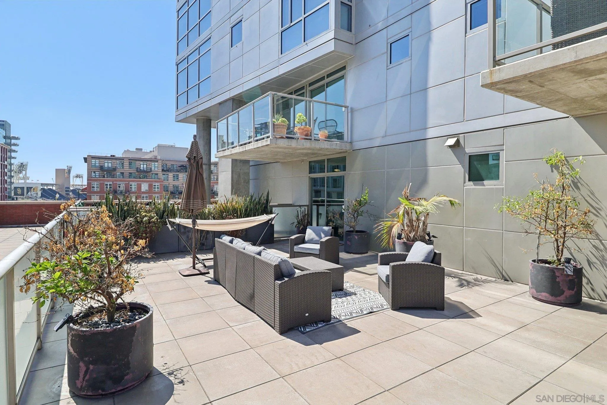 Welcome to this entertainer’s dream in the heart of downtown! A truly one-of-a-kind corner unit boasting an expansive 750 sq. ft. private patio, perfect for soaking in the morning sun, relaxing in the afternoon shade, and entertaining under the city lights. With over 1,858 sq. ft. of combined indoor/outdoor living space, this home is larger than many 2-bedroom units and offers a rare blend of luxury, space, and functionality. Step inside to find an updated kitchen and bath, soaring floor-to-ceiling windows, and high ceilings that flood the home with natural light and frame spectacular city skyline and bay views. The open floor plan includes a spacious living area with a large screen and projector setup, an extra nook ideal for a home office or den, and ample storage throughout. Additional features include upgraded stainless steel appliances, 2 parking spaces located across from one another, and a private storage room. All this, just 2 blocks from Petco Park and 3 blocks to the historic Gaslamp Quarter. Must see to appreciate!