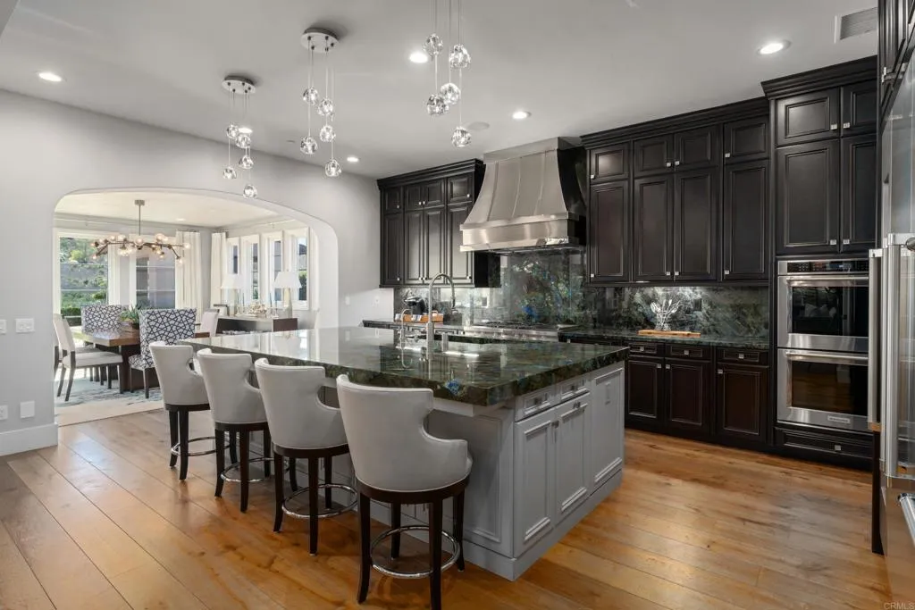 Tailored for elevated living, this exquisitely upgraded residence in the Estates at Del Sur blends refined design, intuitive functionality, and serene privacy. Every detail has been thoughtfully curatedfrom custom millwork and handcrafted finishes to extensive storage and a smart, flowing floor plan. A seamless indoor-outdoor experience unfolds through vanishing pocket doors and a motorized screen, opening the heart of the home to the expansive California Room, complete with built-in heaters and a fireplace. Inside, the gourmet kitchen makes a statement with rare Lemurian Blue granite counters, dual refrigerators, a walk-in pantry, and extensive custom cabinetrydesigned for both everyday comfort and elevated entertaining. Wide-plank Duchateau oak flooring runs throughout the main living areas, complemented by dramatic lighting from top-tier designers and handmade Phillip Jeffries wallpaper in the dining room, powder room, and primary suite. The luxurious primary bath features Carrara marble, heated floors, and a spa-like atmosphere, while a secondary suite includes a walk-in jetted tub with chromatherapy, fast-fill and fast-drain functionality. Outdoors, a thoughtfully positioned fire pit provides front-row views of soaring paragliders off Black Mountain, occasional hot air balloons, and roaming local wildlife. The built-in BBQ pavilion includes granite counters, a sink, refrigerator, and mature fruit treespomegranate, lime, lemon, and Valencia orange. Additional highlights: wide paver walkways designed for strollers or mobility access, five-zone HVAC system, custom cabinet