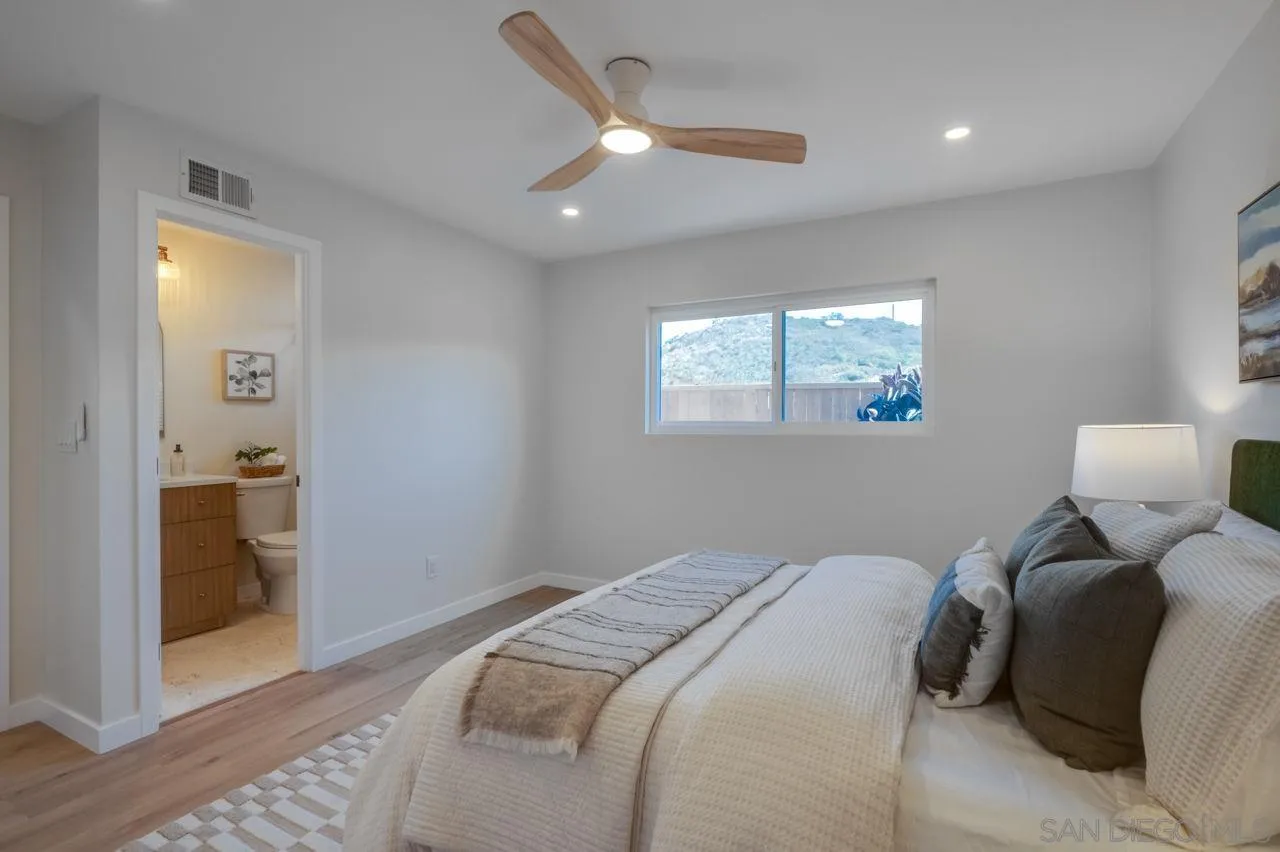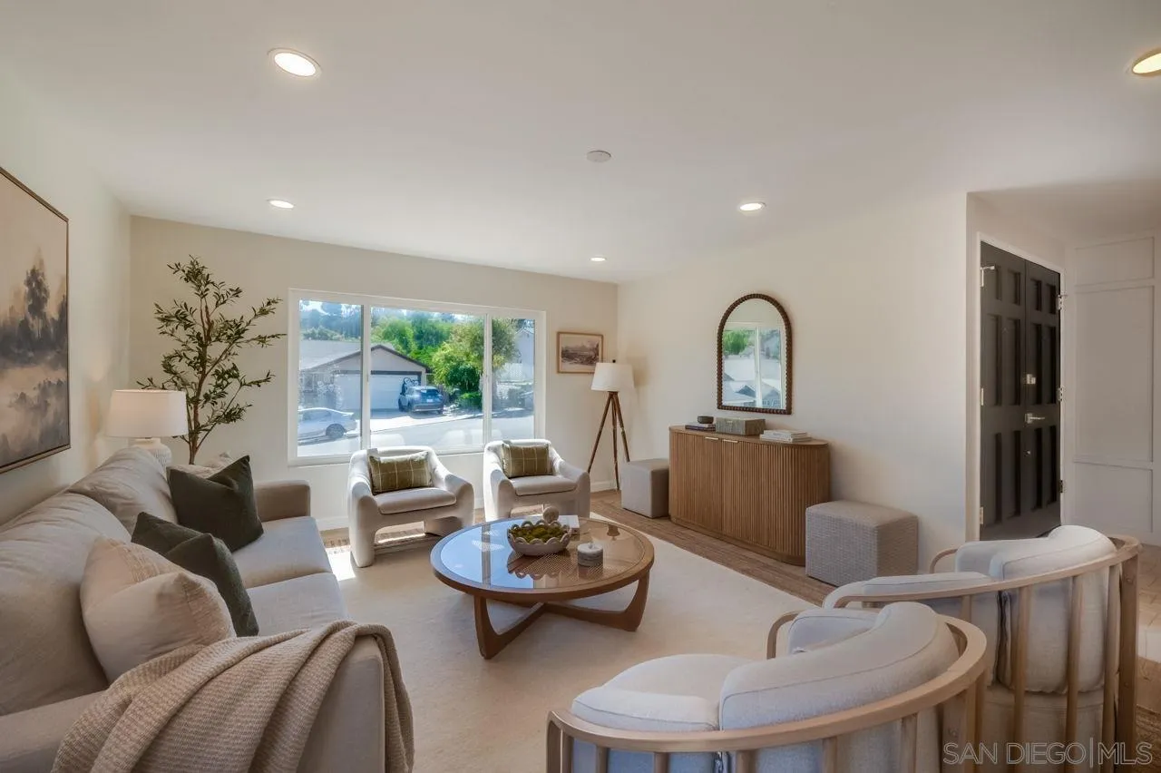 Welcome to this beautifully remodeled single-story 3-bedroom, 2-bath home nestled in the heart of Rancho Peñasquitos, within the highly regarded Poway Unified School District. The interior showcases custom wall paneling, accent lighting, and sleek LVP flooring throughout, creating a warm, comfortable, and inviting living space. The kitchen is thoughtfully designed with quartz countertops, oak-finish cabinetry, a custom range hood, and brand-new stainless steel appliances. Recent upgrades also include a new HVAC system and water heater, ensuring comfort and efficiency year-round. French doors lead to a private backyard featuring scenic hill views, fresh sod, and a charming pergola, ideal for entertaining or unwinding outdoors. The front yard is highlighted by tasteful native landscaping, offering attractive curb appeal with low-maintenance living. Ideally situated within walking distance to Rolling Hills Elementary School and just steps from a neighborhood park, this home combines comfort, convenience, and location in one of San Diego’s most desirable communities.