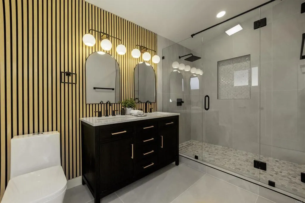 THE HOME YOULL NEVER WANT TO LEAVE. So much interest before it even hit the market. The seller replaced everything – except the views. Exceptionally unique, this home offers two primary suites, each with fully redesigned modern bathrooms. REIMAGINED FROM THE INSIDE OUT, this single-level home has been completely redone with care and quality. Youll find all new exterior stucco, new drywall, fresh paint inside and out, new luxury vinyl plank floors, new baseboards, and all new doors. The open-concept living room and kitchen feature high vaulted ceilings and skylights, filling the home with natural light. At the center of it all is the beautiful kitchen island that seats up to six, perfect for meals or gatherings. The kitchen features custom cabinets, quartz countertops, and new stainless steel appliances. With four bedrooms and three bathrooms, this home also includes new plumbing, electrical, heating, new air conditioner, a deck, a fence, windows, a spacious driveway that can comfortably fit up tofourcars and a brand-new garage door with a sleek epoxy floor. Enjoy the private backyard with fresh landscaping. All brand-new furniture is available for sale, creating a complete, turn-key experience. Located in Allied Gardens, youre close to parks, great schools, the recreation center, and Mission Valley. ENVISION YOUR FAMILY HERE – this is the perfect place to call HOME.