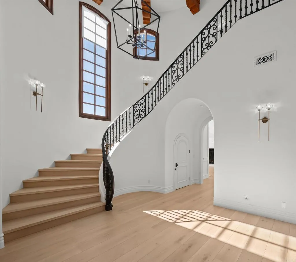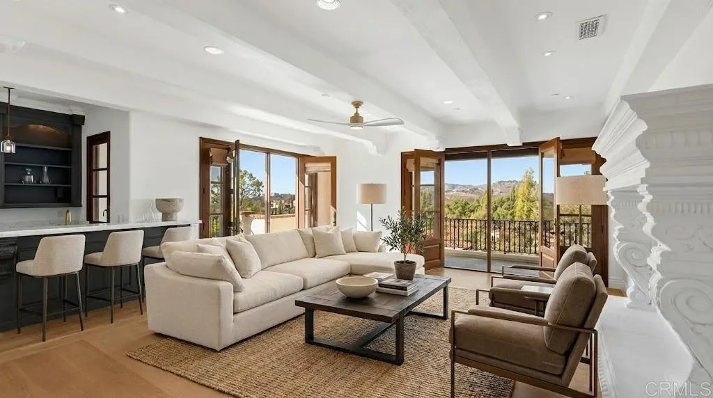 This stunning 5+ bedroom modern European estate offers an expansive view that overlooks the 9th Fairway and iconic clubhouse within the prestigious guard-gated community of The Bridges in Rancho Santa Fe. Extensively remodeled, completed in 2025, the 8,900+sqft residence captures the essence of refined living with a seamless blend of craftsmanship, comfort, and designall framed by one of the communitys most sought-after views. Inside, natural light pours through expansive windows and French doors that open to the golf course, creating a perfect indoor/outdoor connection ideal for both daily living and entertaining. Every finish was chosen with carefrom hand-finished limewashed fireplaces and European white-oak floors to Italian marble countertops, burnished-brass fixtures, and designer lighting. The reimagined kitchen serves as the heart of the home with a farmhouse-style sink, premium appliances, oversized walk-in pantry, bar, and temperature-controlled wine cellar that make entertaining effortless. Additional spaces include a built-out home theater, elegant office, and a separate guest wing with private access that offers versatility for guests, multigenerational living, or creative use. The primary suite is a true retreat, featuring a newly remodeled bathroom in Italian marble with dual vanities, a freestanding soaking tub, and spa-like tranquility. Outside, the lush grounds create a resort-like backdrop for year-round living with a saltwater pool and spa, built-in BBQ bar, and sweeping fairway views framed by golden evening light over the clubhouse. Set within one of Ra