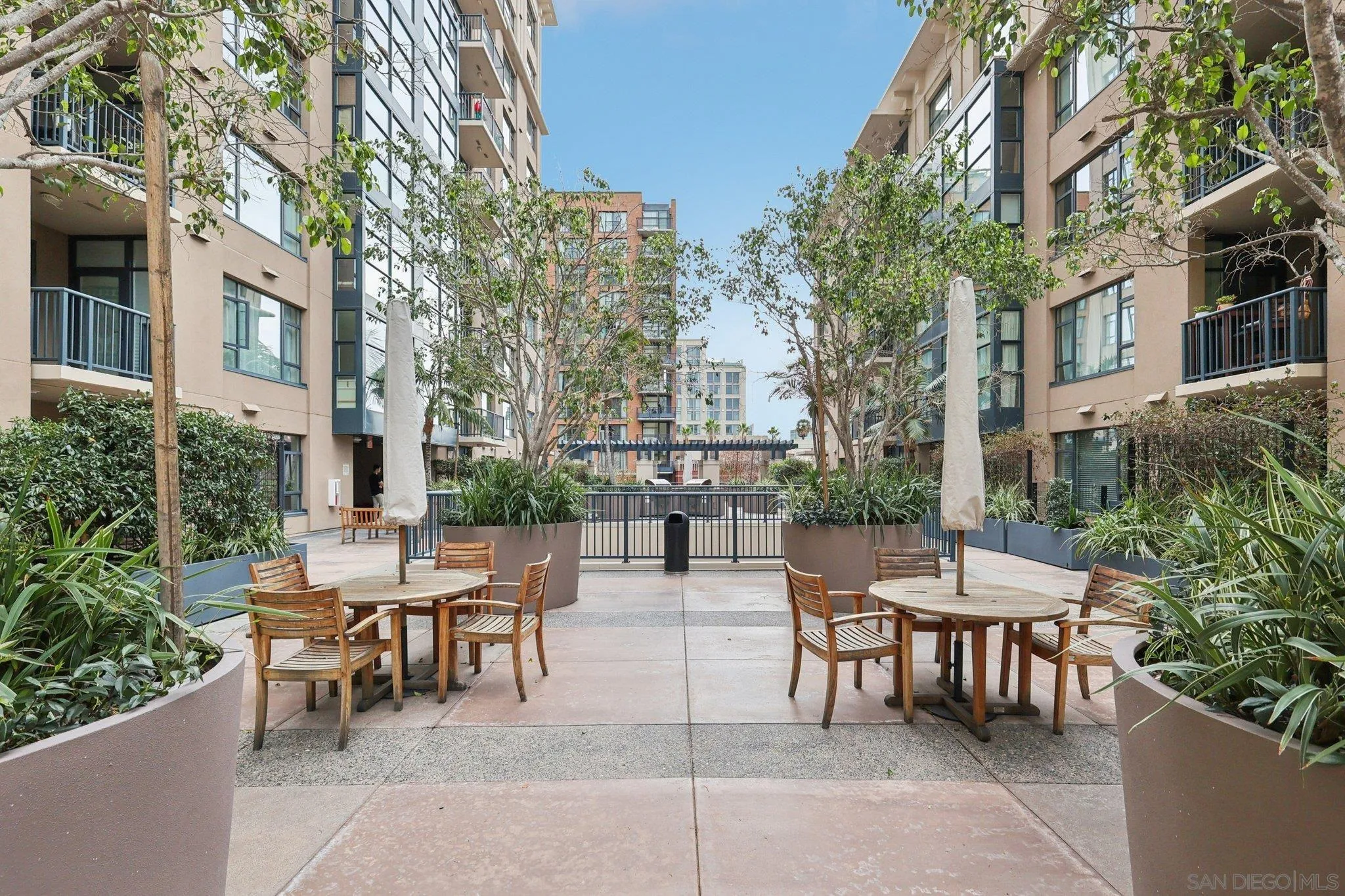 Light and bright, this spacious one-bedroom condo at Trellis on 5th offers the ultimate downtown lifestyle. The sleek, modern interior features a neutral color palette, open floor plan, and large picture windows that fill the space with natural light. The updated kitchen boasts quartz countertops, a glass tile backsplash, breakfast bar seating, and stainless steel appliances—perfect for entertaining. The bedroom accommodates a king-size bed and includes ample closet space, and a large updated bathroom with dual access. Additional highlights include in-unit laundry and one secure parking space. Residents enjoy resort-style amenities such as a 24-hour fitness center, BBQ courtyard, parcel lockers, and nightly on-site security. Ideally located in the East Village/Gaslamp district, you’ll have easy access to restaurants, cafés, nightlife, Petco Park, the Rady Shell, and scenic harbor walks—perfect for those seeking a vibrant urban lifestyle or a stylish pied-à-terre.