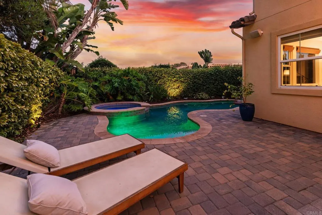 The perfect family retreat less than a mile from the beach, this residence combines spacious design with a lush, tropical atmosphere. Ideally situated along the coast and within walking distance of shops, dining, and hiking trails, the 5-bedroom home rests on a 0.36-acre corner lot with a sparkling pool and no neighbor on one side. Inside, soaring ceilings highlight a thoughtful floor plan that includes a main-level suite with a full bath and private outdoor access. The chefs kitchen is equipped with GE appliances, dual convection ovens, a griddle, warming drawer, pot filler, and hidden spice racks built seamlessly into the decorative range columns. A nearby powder bath for guests and a spacious laundry room add convenience. All five bedrooms feature en-suite baths with tiled tub surrounds, walk-in closets, and timeless plantation shutters. The primary suite serves as a private sanctuary, complete with dual walk-in closets and a serene, restful ambiance. Designed for effortless indoor-outdoor living, the home offers multiple patios and a covered courtyard with a fireplacerecently enclosed for enhanced privacy. The resort-style backyard boasts turf, vibrant landscaping, a soothing fountain, and a sparkling pool and spa, creating the perfect setting for entertaining or relaxing under the sun. Bonuses include owned Tesla solar and a powerwall back up battery. Close to the San Diego Botanic Garden, Encinitas Ranch Golf Course, the Coastal Rail Trail, Moonlight Beach, and morethis home truly has it all. Welcome home.