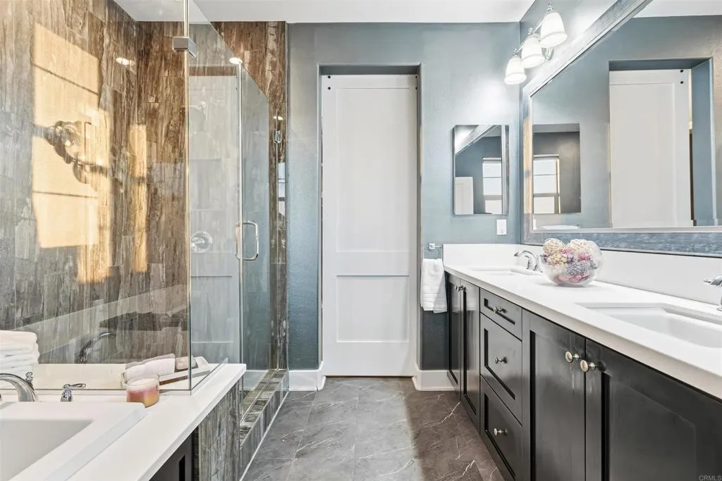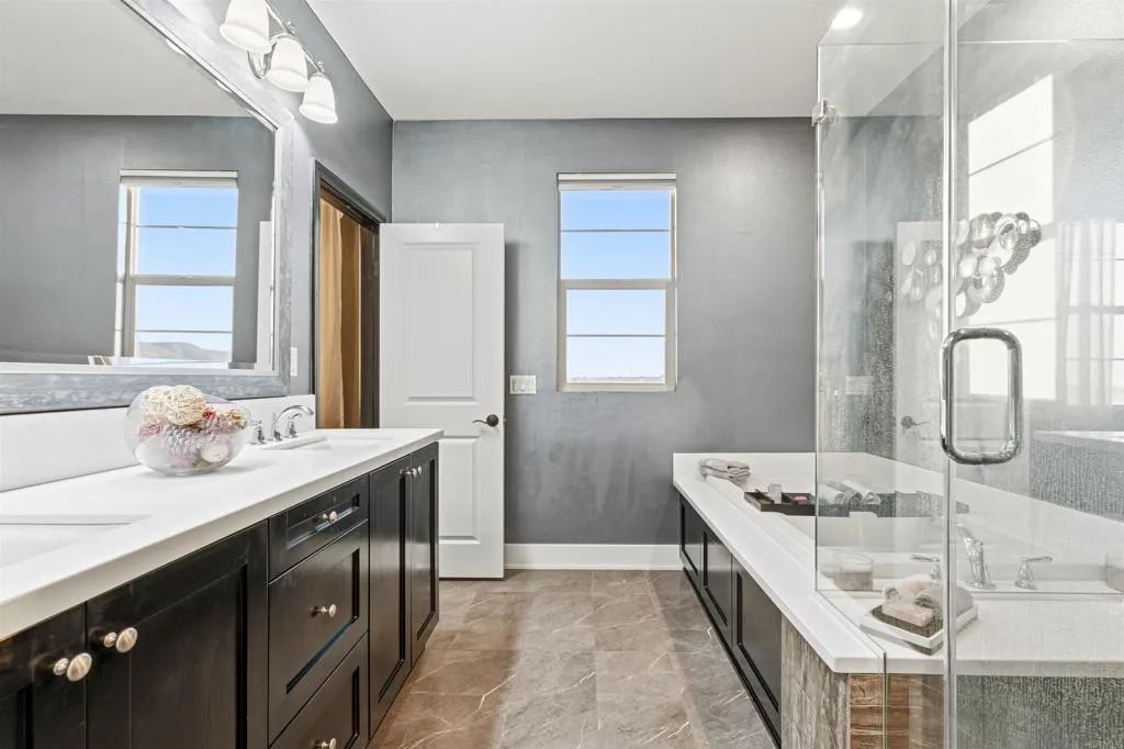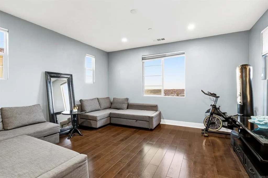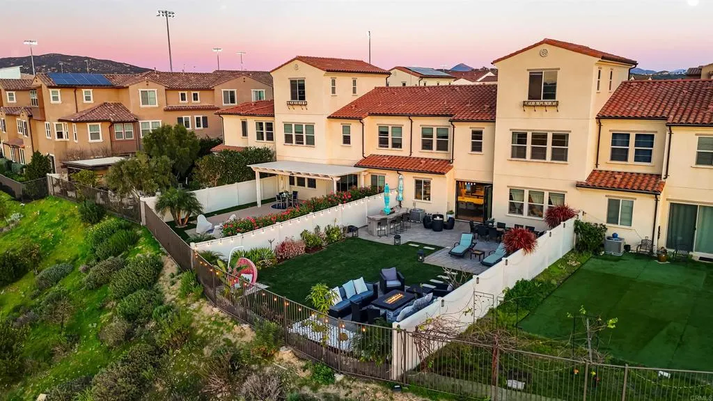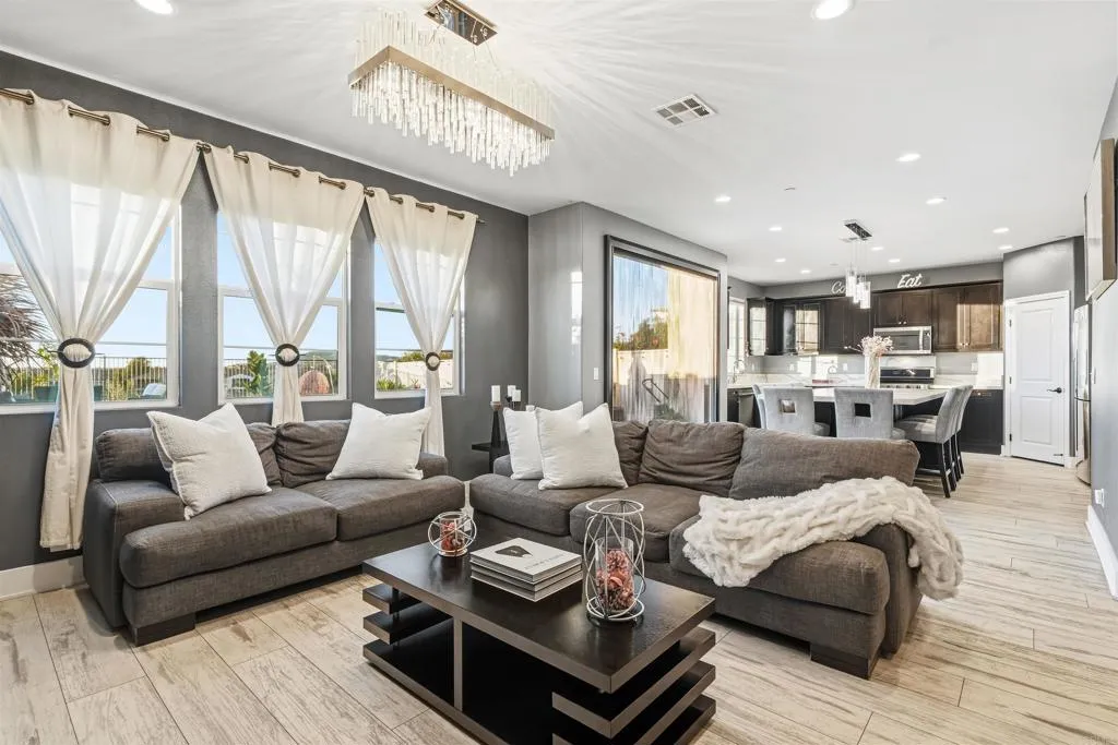 Experience breathtaking views that include Canyon and partial ocean view from this exceptional 5 bedroom residence plus a third-floor loft located in the highly sought-after gated Veridian community of Black Mountain Ranch/Del Sur. Built in 2017, this beautifully designed home offers spacious, modern living with thoughtful upgrades and abundant storage throughout, including a convenient bedroom on the main level, ideal for guests, multi-generational living, or a home office. The open-concept main level showcases a chefs dream kitchen featuring espresso cabinetry, sleek white and grey finishes, and an oversized island that comfortably seats eight, ideal for entertaining and everyday living. The contemporary color palette of crisp whites and soft greys creates a bright, modern aesthetic throughout the home. An upgraded French door opens effortlessly to the outdoors, creating seamless indoor/outdoor living and filling the home with natural light, perfectly setting the stage for the incredible backyard that follows. Step outside to a huge, professionally designed backyard featuring a built-in BBQ island, fire pit, outdoor dining area, and breathtaking panoramic canyon, mountain , and partial ocean views, an entertainers paradise and the perfect setting for relaxing or hosting gatherings. Upstairs, the primary suite is a true retreat, offering generous space, abundant natural light, and a luxurious, spa-inspired bathroom. The suite is complemented by a custom walk-in closet, designed with magazine-worthy detail and finished with a stylish barn door, providing exceptional organiz