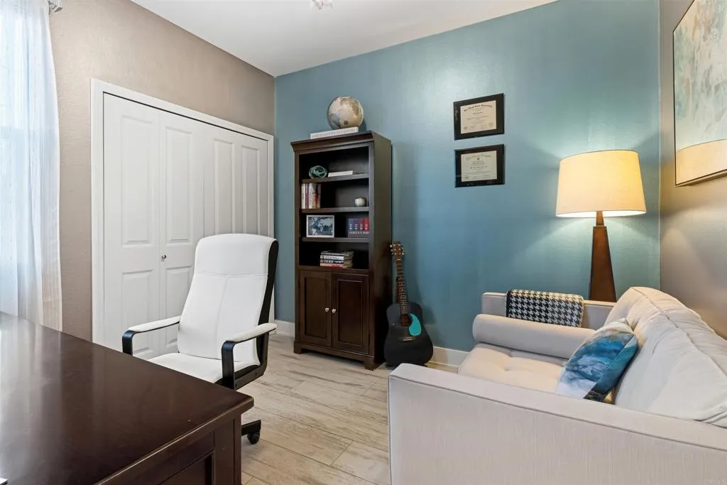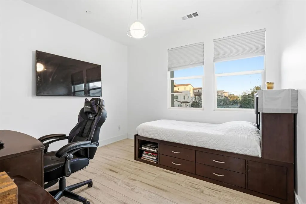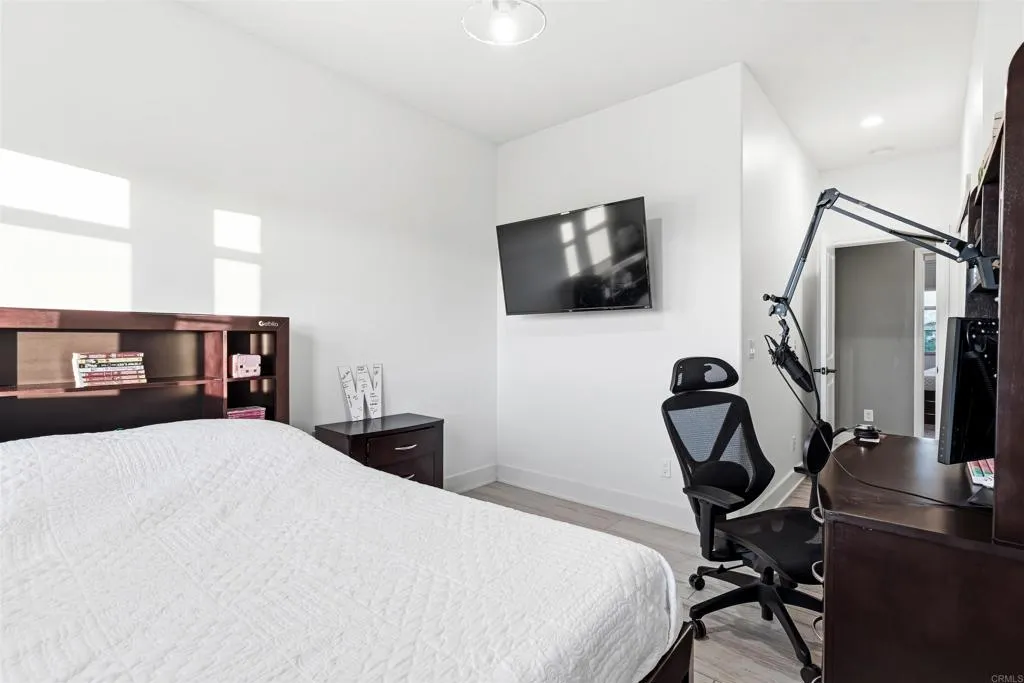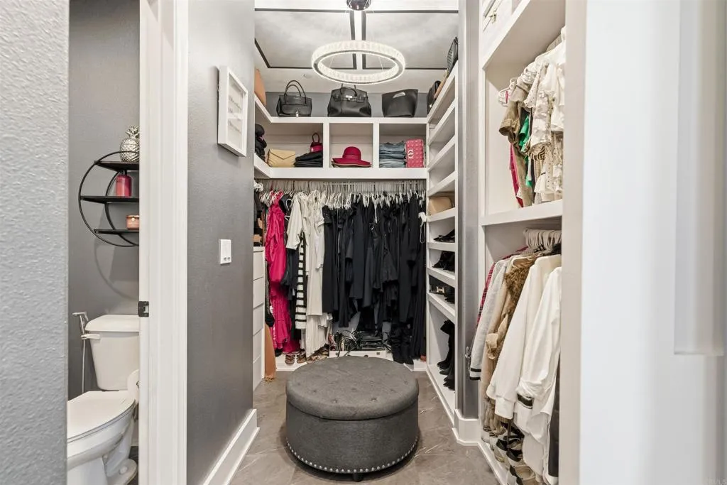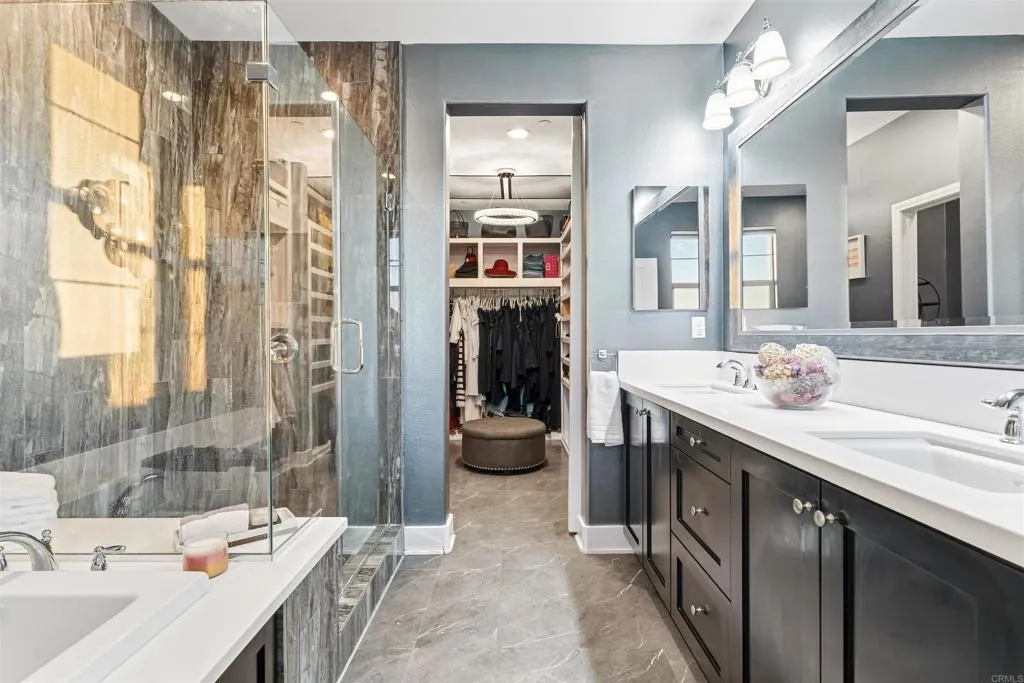 Experience breathtaking views that include Canyon and partial ocean view from this exceptional 5 bedroom residence plus a third-floor loft located in the highly sought-after gated Veridian community of Black Mountain Ranch/Del Sur. Built in 2017, this beautifully designed home offers spacious, modern living with thoughtful upgrades and abundant storage throughout, including a convenient bedroom on the main level, ideal for guests, multi-generational living, or a home office. The open-concept main level showcases a chefs dream kitchen featuring espresso cabinetry, sleek white and grey finishes, and an oversized island that comfortably seats eight, ideal for entertaining and everyday living. The contemporary color palette of crisp whites and soft greys creates a bright, modern aesthetic throughout the home. An upgraded French door opens effortlessly to the outdoors, creating seamless indoor/outdoor living and filling the home with natural light, perfectly setting the stage for the incredible backyard that follows. Step outside to a huge, professionally designed backyard featuring a built-in BBQ island, fire pit, outdoor dining area, and breathtaking panoramic canyon, mountain , and partial ocean views, an entertainers paradise and the perfect setting for relaxing or hosting gatherings. Upstairs, the primary suite is a true retreat, offering generous space, abundant natural light, and a luxurious, spa-inspired bathroom. The suite is complemented by a custom walk-in closet, designed with magazine-worthy detail and finished with a stylish barn door, providing exceptional organiz