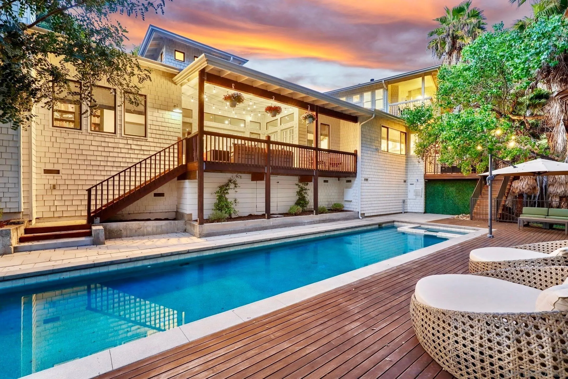 Fall in love with this exquisite Mount Helix Dream Home, featuring a private detached two-bedroom guest house and a 70-foot saltwater lap pool and spa—offered fully furnished and truly move-in ready! This masterpiece is a testament to stylish, modern living with seamless indoor/outdoor living, creating a personal resort ideal for relaxing, dining al fresco, swimming, or entertaining across multiple expansive decks and outdoor spaces. Over $435,000 in recent upgrades highlight the impeccable attention to detail throughout both the main residence and guest house, including newly refreshed hardwood flooring, interior paint, custom window treatments, motorized shades, air conditioning, security and surround-sound systems, cutting edge WiFi, pool pump, rain gutters, stove/oven, and a custom-designed primary walk-in closet. Architectural features include soaring ceilings from 11 to 20 feet, multiple levels, and a dynamic layout that offers exceptional flow and visual interest. The gourmet chef’s kitchen is a showpiece with premium cabinetry, quartz countertops, decorative tile backsplash, a massive waterfall island, high-end stainless steel appliances, pendant lighting, and a reeded-glass walk-in pantry, opening seamlessly to the dining area. The living room offers warmth and sophistication with a striking stone fireplace and built-in library, while an additional flex room with built-in cabinetry and desk provides ideal space for work or relaxation, plus a cozy reading nook with bench seating.