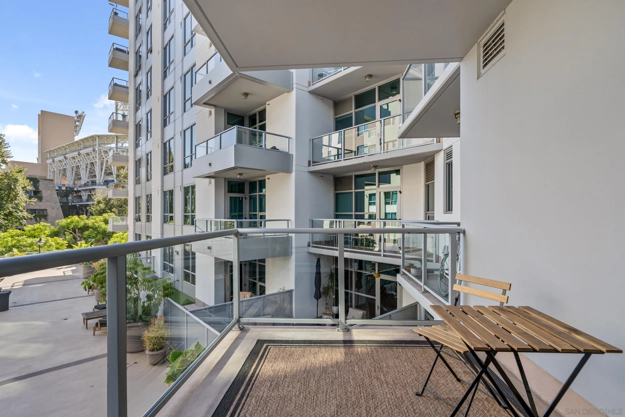 Perfectly positioned across from Petco Park, this thoughtfully designed condo offers a peaceful retreat with incredible city lifestyle perks just a short distance away. Enjoy views of the courtyard and stadium from an oversized balcony that extends your living space outdoors—ideal for morning coffee or evening unwinding. Inside, bright, wide-plank vinyl floors complement the open layout, while the kitchen impresses with granite countertops, stainless steel appliances, and abundant cabinet space. Custom lighting, updated bathroom tile, and organized closets complete the move-in-ready appeal. This residence also includes a dedicated underground parking space. Park Terrace is a VA-approved community offering exceptional amenities, including 24-hour security, a fully equipped fitness center, rooftop BBQ terraces on the 2nd and 5th floors, a recreation room, interior courtyard seating, bike storage, on-site property management, and a sleek, modern lobby entrance. Explore the best of Downtown living—just a short distance to Petco Park, Gallagher Square, the historic Gaslamp Quarter’s shops and dining, the Central Library, bus and trolley transportation, FIT Athletic Gym, and the Harbor Drive Pedestrian Bridge, which connects to The Rady Shell, the Convention Center, Seaport Village, Embarcadero Parks, the Coronado Ferry, and more. The lifestyle you’ve been waiting for starts here.