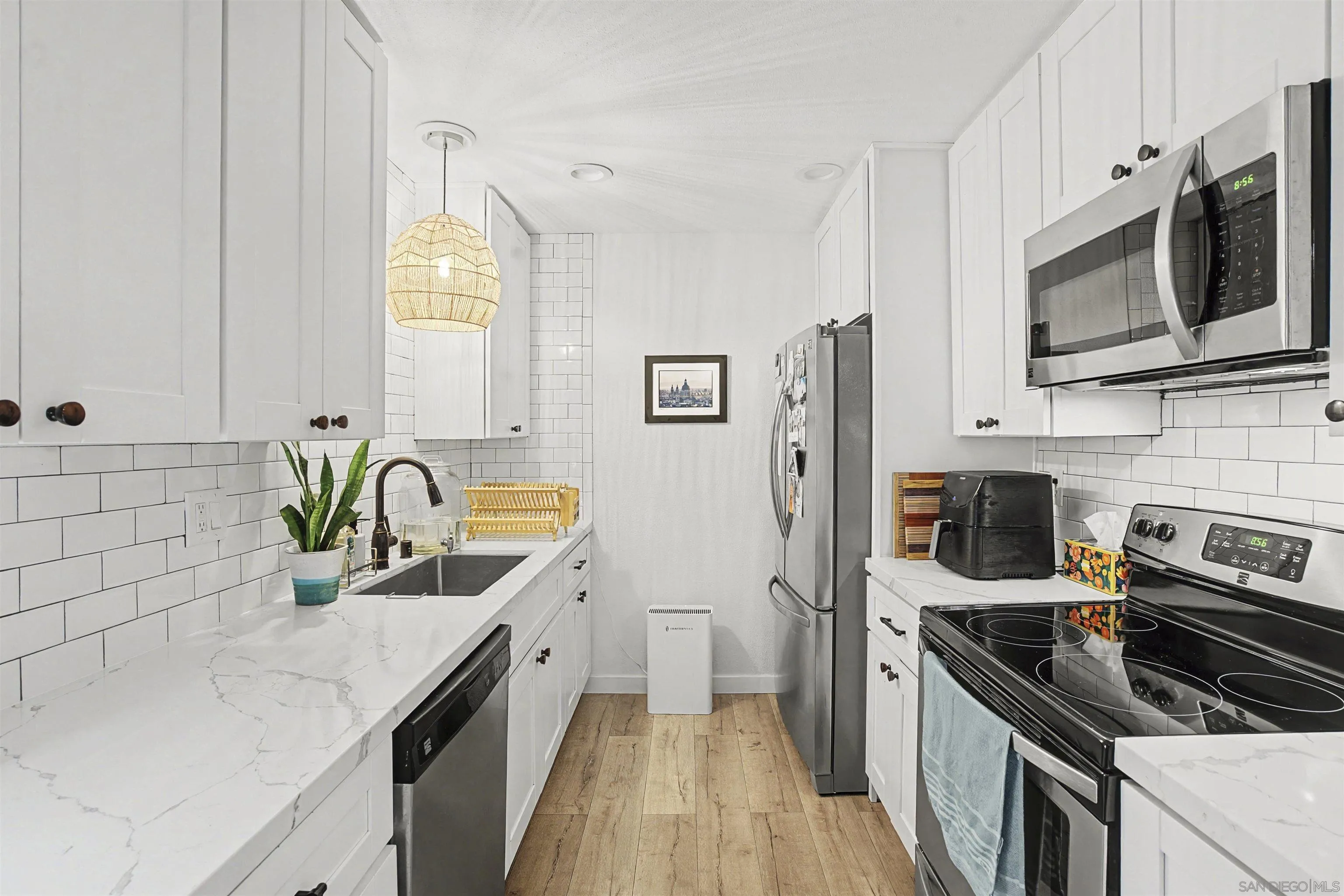 Set within a gated community featuring a pool and spa, tennis courts, and clubhouse, this home delivers the “lock-and-leave” lifestyle with real amenities. Enjoy the convenience of walking to nearby shopping, restaurants, and local hiking trails—plus you’re just minutes from the beaches and the energy of Carlsbad Village. Fresh, modern retreat where the interior has been completely transformed. Modern kitchen shines with crisp shaker cabinetry (soft-close drawers and doors), quartz countertops, classic subway-tile backsplash, stainless appliances. And contemporary hardware that ties it all together. The light-filled living room and bedroom both open to an oversized patio, creating an easy indoor-outdoor flow that feels bigger than expected. You’ll also love the practical upgrades: indoor laundry hookups, two closets in the bedroom, an additional storage unit, and two covered parking spaces—a rare bonus in coastal North County.