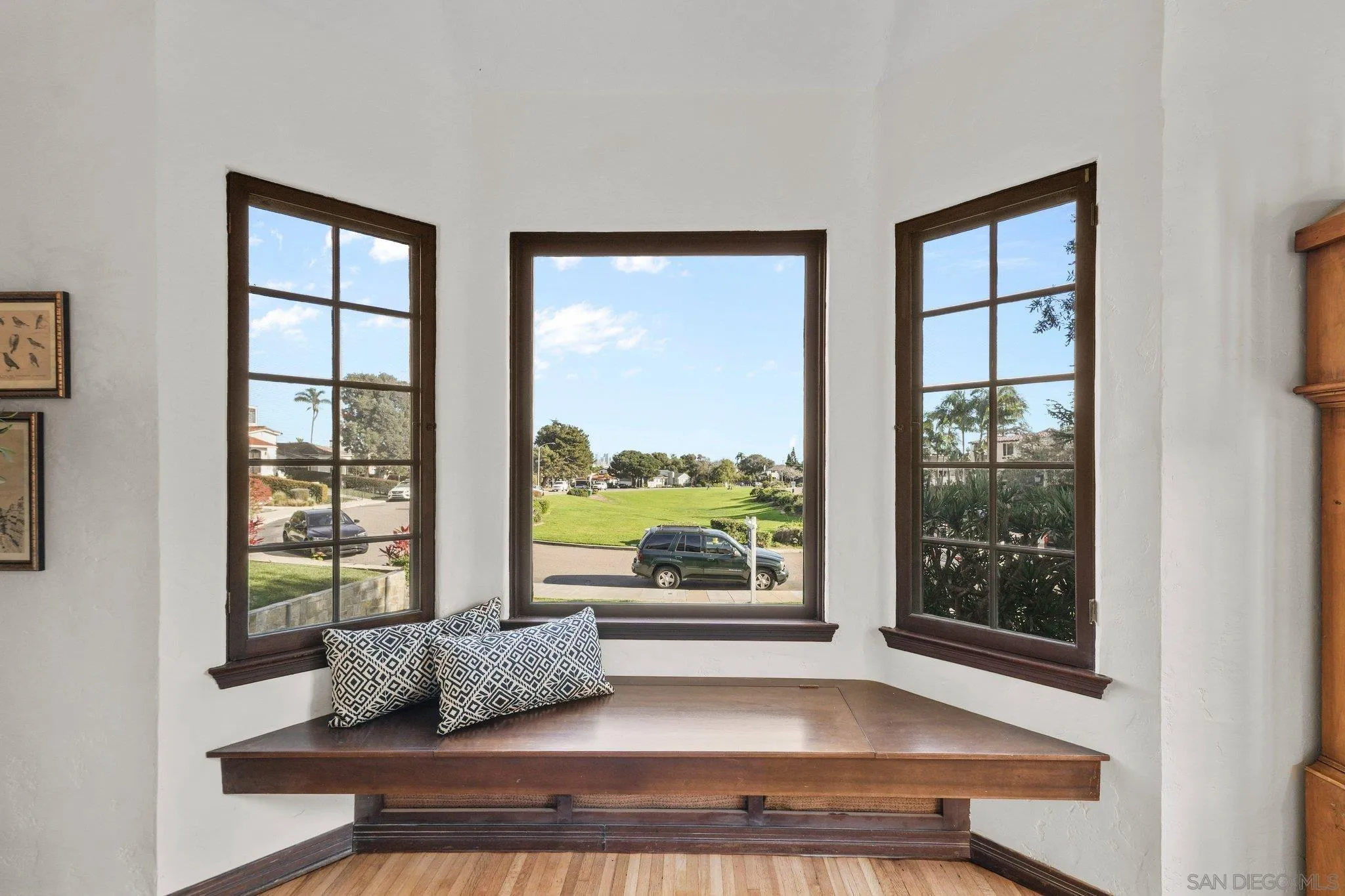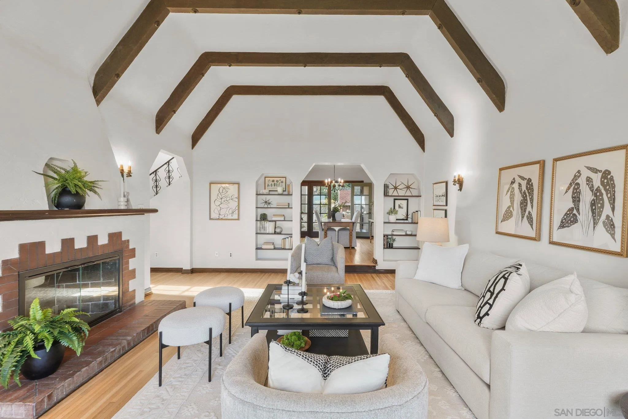 Welcome to your front row seat to one of the most charming neighborhoods around. Perched proudly at the top of Plumosa Park, this 1929 English Tudor is the kind of home that makes you slow down and smile. Like something straight out of a storybook, this five-bedroom, two-bath classic brings you timeless character in an ideal location. From the moment you step inside, the home oozes original charm: rich hardwood floors, exposed beam ceilings, wrought-iron details, and multiple sets of French doors that spill out to a brick patio out back – perfect for morning coffee or evening gatherings. The spacious kitchen opens to a welcoming family room, creating a natural hub for everyday living and entertaining alike. From select rooms, enjoy peek-a-boo views beyond the park to the San Diego skyline and the iconic Coronado Bridge. The downstairs floorplan offers both formal and informal living spaces, along with two bedrooms and a full bath—ideal for guests, a home office, or flexible living. Upstairs, you’ll find three additional bedrooms and a second full bath, all tucked away for privacy and quiet. A rare bonus for the park: this is one of the few homes with a private driveway and a front-accessed garage, complete with large attic access for storage or future possibilities.