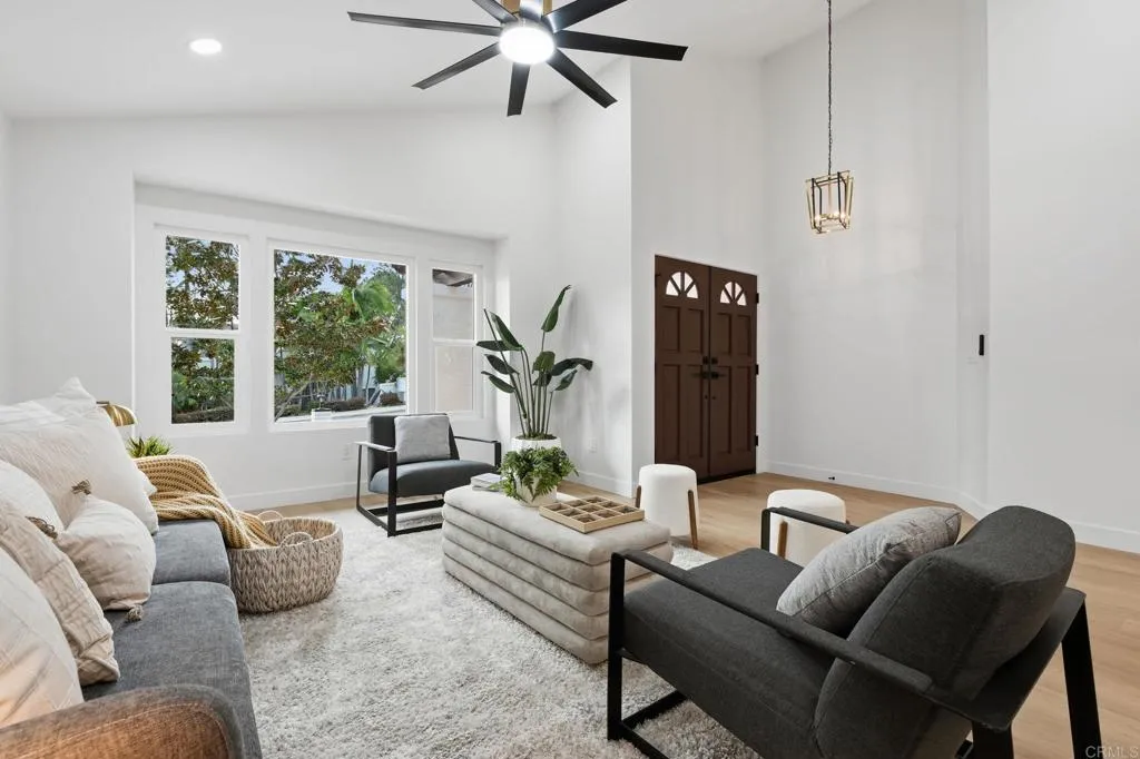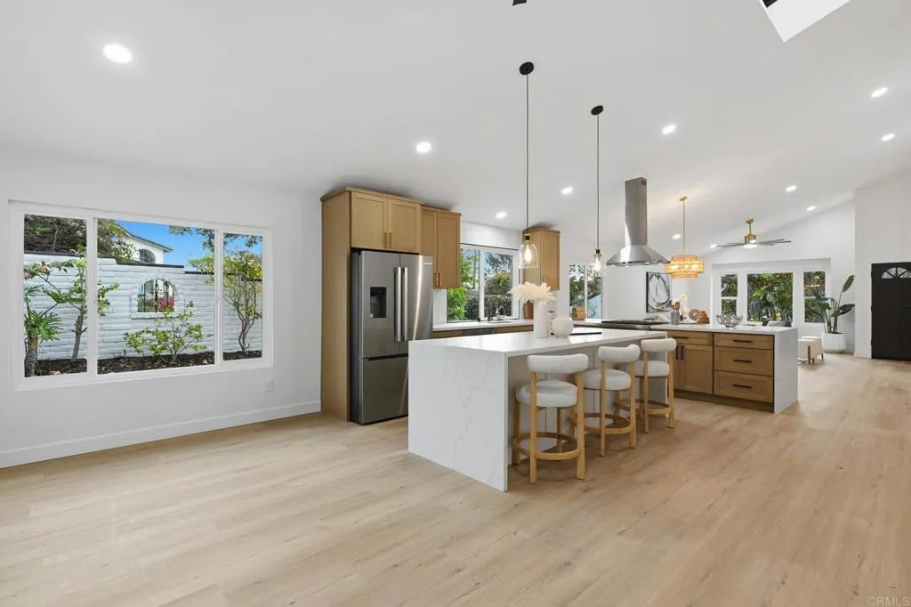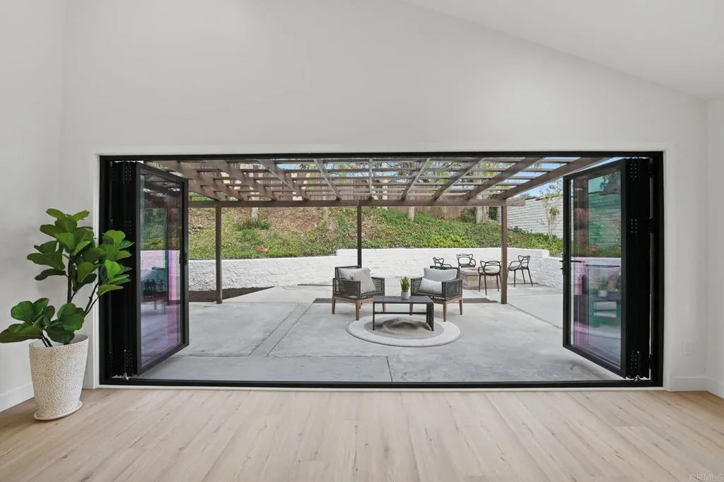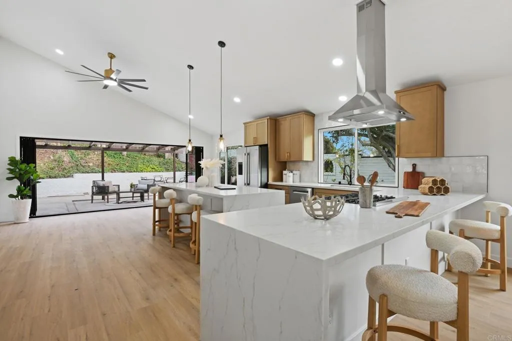 Beautifully transformed Spanish single story 3-bedroom, 2 bath executive home thoughtfully re-imagined throughout. The stunning open-concept kitchen features brand new cabinets, Upgraded Bosch Appliances and an oversized island with waterfall edges, perfect for entertaining and flows seamlessly into the main living space beneath soaring vaulted ceilings. A dramatic 16-foot bi-fold door opens to a private, low-maintenance backyard with inviting gas firepit, creating exceptional indoor-outdoor living, covered by a tranquil trellis. Upgraded luxury vinyl plank flooring runs throughout the home. Primary suite offers vaulted ceilings, double vanity, and another 12-foot bi-fold door, walk-in closet and a completely remodeled spa-inspired bathroom. Both secondary bedrooms include sliding doors that open to a peaceful side yard retreat. All bathrooms have been fully upgraded with brand-new cabinetry and finishes. On a private corner lot at the end of the street with only one neighboring home, this property backs directly to Natural Trails Park, offering privacy and scenic surrounding. Located close to the Pacific Ocean and world-famous beaches, in one of the most desirable neighborhoods in the area. This is a rare opportunity you don’t want to miss.