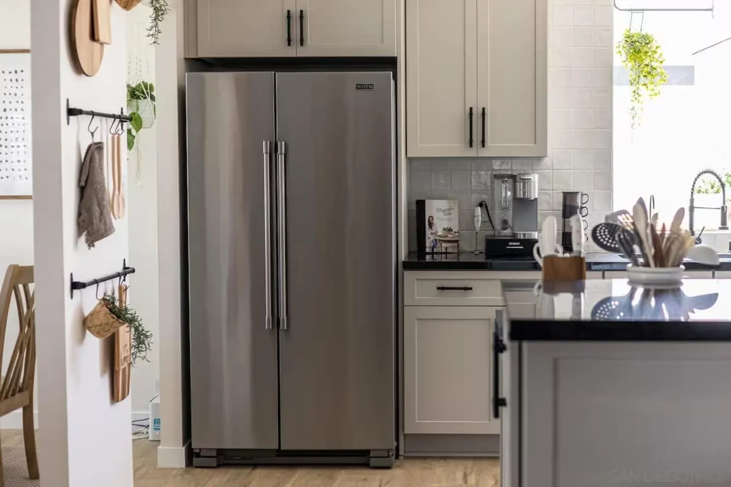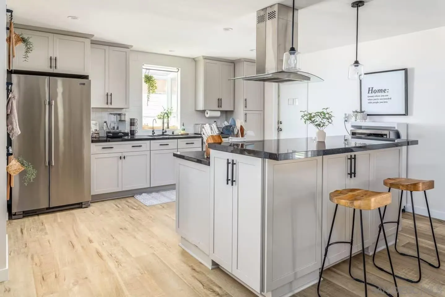 Beautiful single-story home with paid-off solar and a fully equipped attached ADU! The main house offers 3 bedrooms and 2 bathrooms with an open, inviting floor plan and tasteful upgrades throughout. The kitchen features granite countertops, stainless steel appliances, a professional-grade vent hood, bar-height counter, and plenty of natural light. Hardwood and laminate flooring extend throughout, complemented by skylights and recessed lighting for a bright interior. The ADU includes 1 bedroom, 1 bath, a full kitchen, laundry, and its own gated entrance, making it perfect for guests, multigenerational living, or added rental income. Both units are currently active short-term rentals with solid booking histories and excellent reviews. The permitted covered patio extends the roofline, creating a perfect year-round entertaining space. The backyard features turf and pavers with separate fenced yards for each unit and no neighbors to the rear for added privacy. Additional highlights include air conditioning in both units, a 2-car garage with direct kitchen access, a fully fenced lot with vinyl and black fencing, and no HOA or Mello Roos. Ideally located just off the 805 at Balboa, within 10 miles of five Level 1 trauma centers, 5.5 miles to Pacific Beach and Mission Bay, 3 miles to SeaWorld, 5 miles to the airport, and 2 miles to USD and Mesa College. Bright, clean, upgraded, and move-in ready—this home offers flexibility, comfort, and unbeatable convenience in the heart of San Diego.