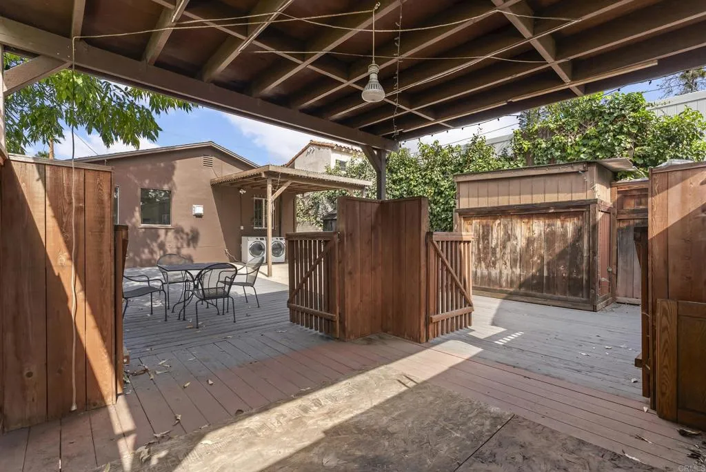 Tucked into one of North Parks most sought-after pockets, this updated bungalow blends classic charm with modern comfort and an unbeatable walkable lifestyle. Step inside to an open, light-filled living space where the spacious living room flows effortlessly into the kitchen and dining area, perfect for both everyday living and easy entertaining. The home features a generously sized primary bedroom and a beautifully updated bathroom with a walk-in shower and farmhouse sink, while the second bedroom offers flexibility as a guest room, nursery, or home office. Out back, a fully fenced and private yard creates your own urban oasis, complete with a covered pergola, lush landscaping, a large eco-stained deck, and two storage sheds, ideal for relaxing, hosting, or expanding your vision. An automated gate provides secure, private access with ample off-street parking, while owned solar and ADU potential add long-term value and opportunity. All of this is just moments from the vibrant restaurants, shops, and parks that make North Park one of San Diegos most beloved neighborhoods.