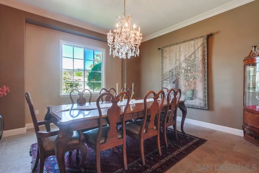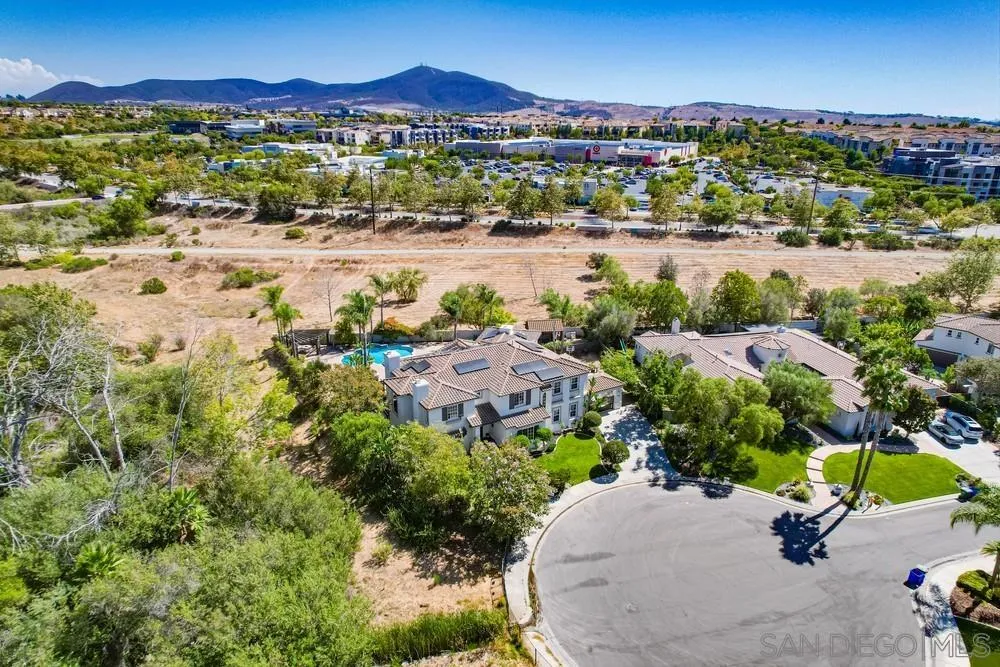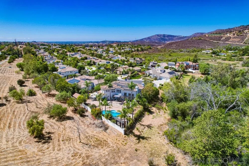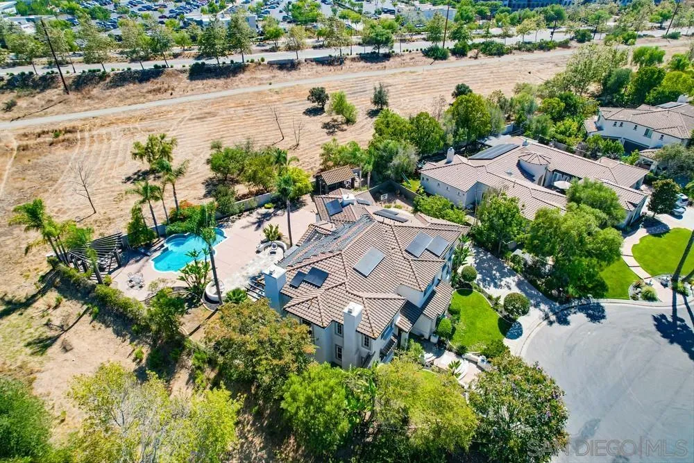 Located in the prestigious gated community of Bel Etage in Santa Fe Valley, this exquisite residence sits on a generous 0.4-acre cul-de-sac lot, offering both privacy and luxury in one of North County San Diego’s most desirable neighborhoods. Surrounded by open space on one side and nestled at the end of a quiet street, this home offers 5 bedrooms with ensuite baths (1 BR/BA downstairs). The flexible floor plan offers formal living and dining rooms, a gourmet kitchen, a large family room with 20+ foot high ceilings, a luxurious primary retreat complete with a sitting room, double-sided fireplace, spa-inspired bathroom and a spacious walk-in closet.Step outside into your private backyard oasis, where resort-style living awaits. The expansive yard includes a sparkling pool, a built in BBQ, a covered sitting area, a custom-built Redwood Tea House, a cozy fire pit, and beautifully landscaped areas for lounging, dining, and entertaining under the stars. Additional highlights of this exceptional property include a four-car garage, owned solar and EV charger. Home is part of Poway Unified School District, known for its academic excellence.