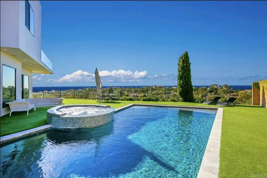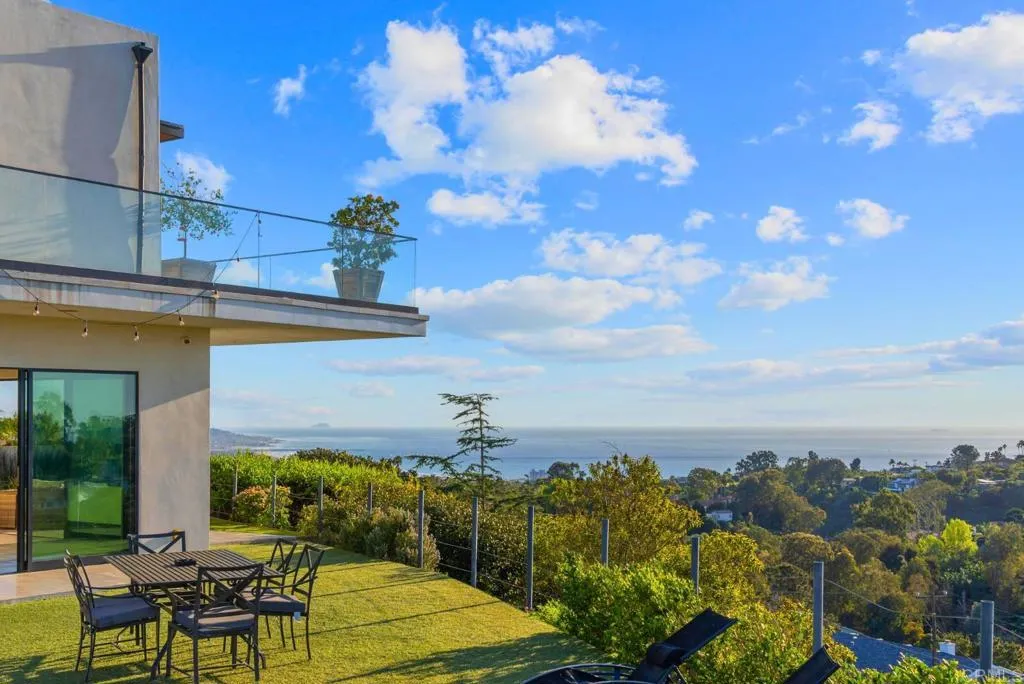 Perched at the top of the iconic Mount Soledad in the heart of La Jolla Alta, this custom contemporary residence offers a rare combination of panoramic ocean and canyon views, privacy, and modern luxury. Enjoy breathtaking vistas stretching from Pacific Beach to Sunset Cliffs, complemented by lush green hills and serene canyon scenery, an exceptional setting that captures the very best of coastal Southern California. Built in 2016 and thoughtfully designed with a contemporary, minimalist aesthetic, the home features an open floor plan with high ceilings and abundant natural light, creating a seamless connection between indoor living spaces and the surrounding landscape. The residence offers 5 spacious bedrooms, each with its own en-suite bathroom and walk-in closet. 4 upstairs bedrooms enjoy direct access to a wraparound scenic balcony, perfect for taking in sunrise and sunset views. Downstairs bedroom is set up as a service-maid’s quarters. Situated on a just-under-half-acre lot at the end of a quiet cul-de-sac in one of La Jollas most family-friendly neighborhoods, the property provides both privacy and convenience. Outdoor living is enhanced by a saltwater pool and jacuzzi with solar heating, along with a detached cabana-style bathroom ideal for poolside use and rinsing off after the beach. The home is fully energy efficient, featuring 36 owned LG solar panels installed free and clear. A large driveway offers ample parking for multiple vehicles or recreational vehicles. This exceptional property combines location, views, modern design, and sustainability, an outstanding