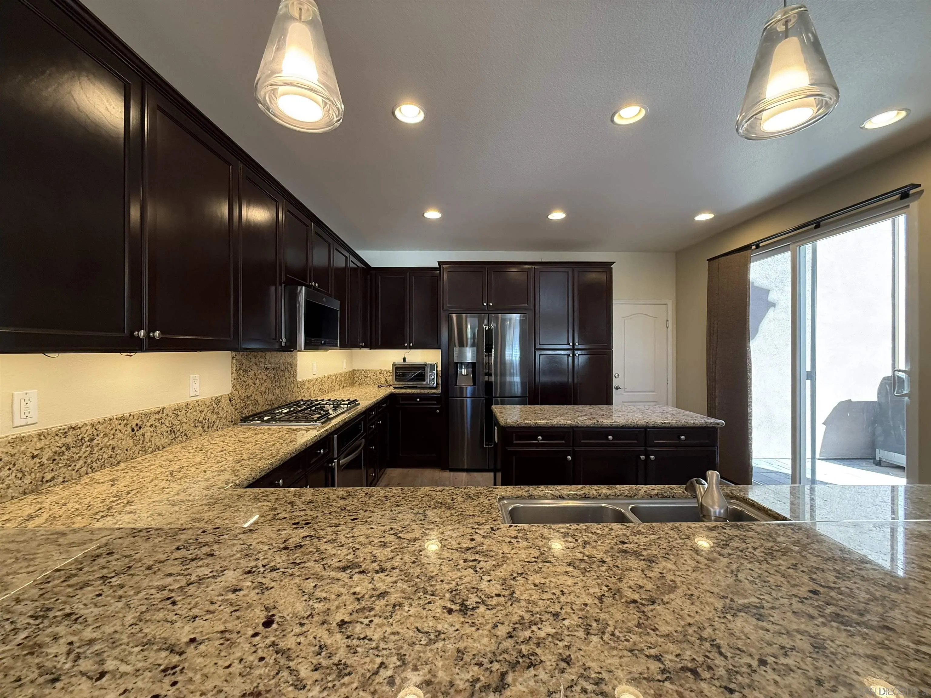 This BEAUTIFUL Bridgewalk property at Del Sur showcases upgrades at every turn and sits on a premium lot overlooking Bristol Ridge Pocket Park, with a newly completed front patio featuring a built-in bench, fire pit, and spacious outdoor dining area; inside, luxurious flooring, wrought iron stair spindles, and an upgraded granite kitchen fill the home with style and natural light, while the garage offers epoxy flooring, high-end storage solutions, and a convenient EV charging outlet—and best of all, the home includes owned and fully paid-off SOLAR.