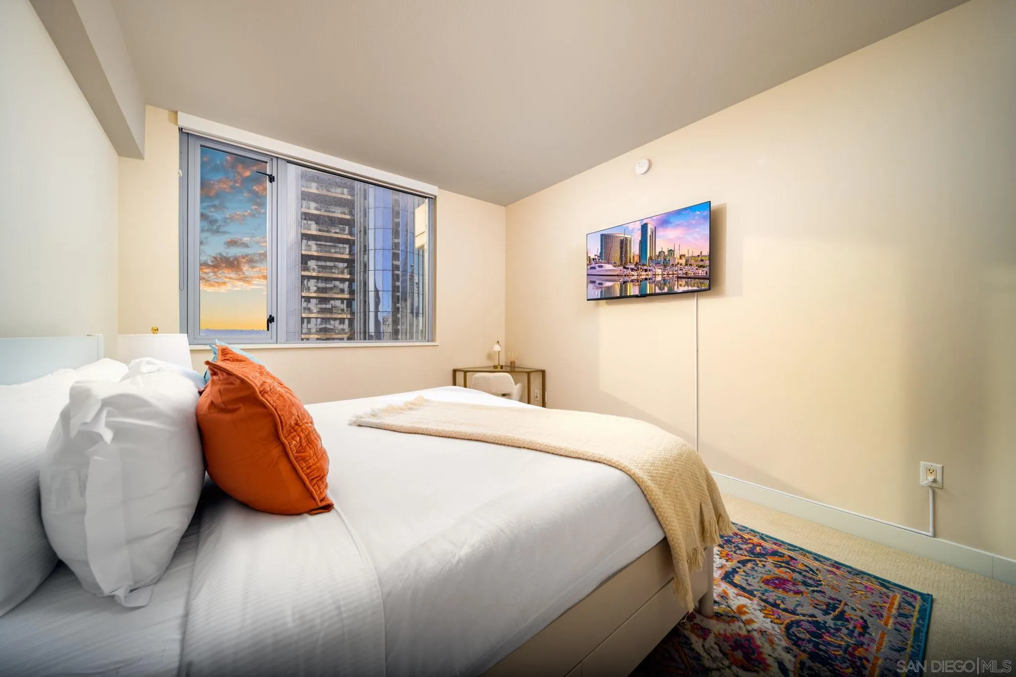 MID- & LONG-TERM FURNISHED RENTAL – Electra Building 2BR with Views, Pool, Sauna & Spa Enjoy an elevated extended stay in the iconic Electra, San Diego’s tallest residential tower, offering full-service amenities and custom elegant decor throughout. This beautifully appointed two-bedroom residence features sweeping bay and water views and a prime location just steps from the waterfront, Little Italy, and downtown dining and entertainment. The light-filled open living area flows seamlessly into a fully stocked kitchen, creating a comfortable space to cook, dine, and unwind while enjoying the views. Sliding glass doors open to a private balcony with lounge seating, ideal for morning coffee or evening relaxation. The primary bedroom serves as a serene retreat with a walk-in closet, en-suite full bathroom with soaking tub, dedicated work desk, and smart TV. The second bedroom offers flexible accommodations with one double bed and one twin bed, making it well suited for guests, family members, or shared mid-term living. In-unit washer and dryer provide everyday convenience. Residents enjoy Electra’s exceptional amenities including a lap pool, jacuzzi, fitness center, sauna, BBQ area, and beautifully landscaped grounds that feel like a private urban oasis. One assigned parking space with EV charging at the stall is included. Ideal for professionals, relocations, or extended stays seeking comfort, convenience, and downtown sophistication. Sleeping setup accommodates up to five guests. Rates vary by season and length of stay.