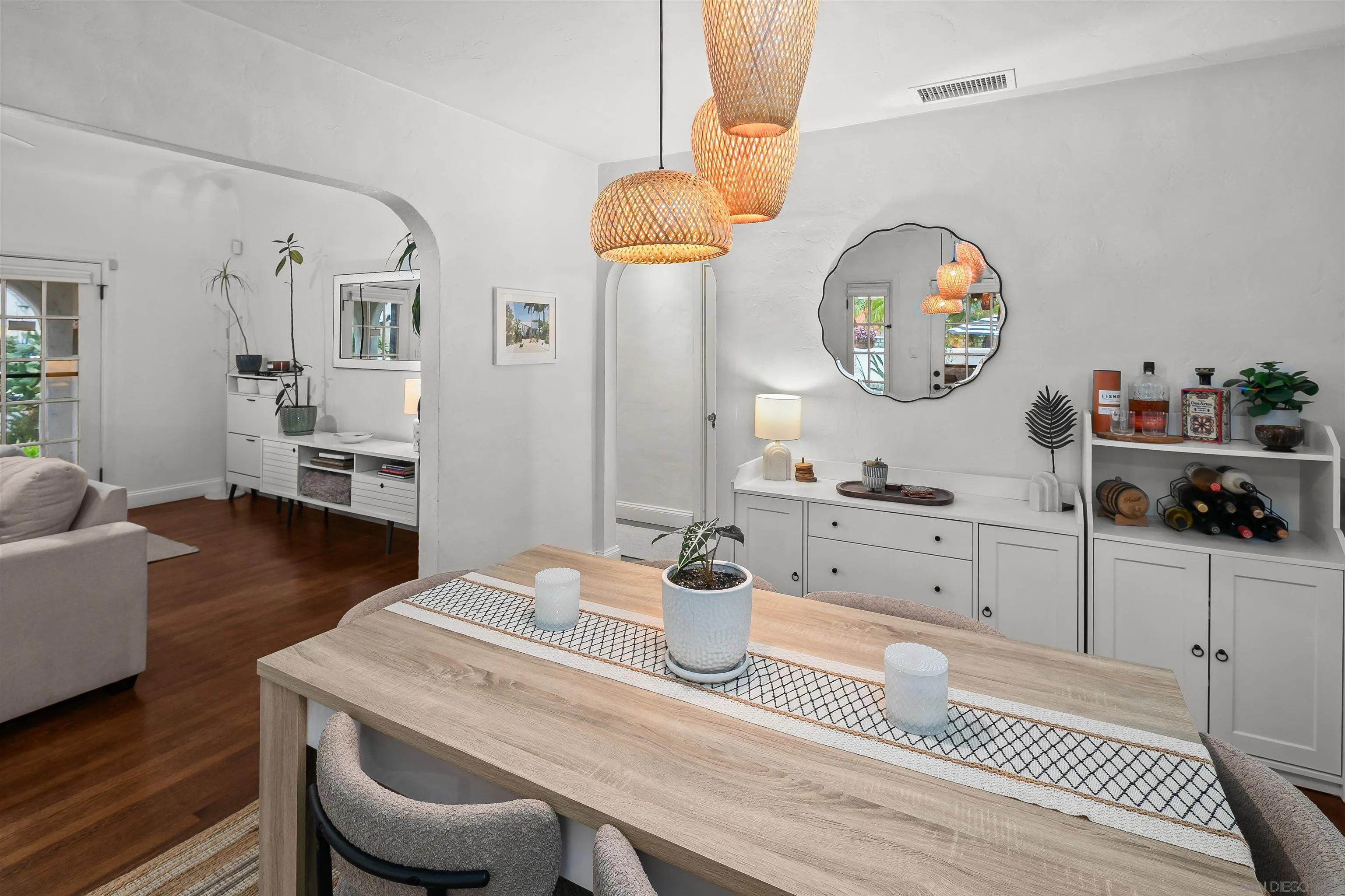 Welcome to Casa De Harvard, a Spanish Revival home set on a desirable 6,000 square foot corner lot that offers privacy, charm, and exceptional indoor outdoor living. A gated driveway leads to a fully enclosed courtyard that provides rare privacy and a peaceful outdoor retreat. The dining room opens directly to a covered lanai accented with charming Talavera tile, creating seamless flow for everyday living and weekend gatherings. Inside, classic character meets thoughtful updates. Original oak hardwood floors, coved ceilings, and abundant natural light create a warm and welcoming atmosphere. The updated kitchen features quartz countertops, a generous center island with seating, stainless steel appliances, ample cabinetry, and a farmhouse sink. Just off the kitchen, an enclosed sunroom serves as a flexible bonus room ideal for a guest room, home office, creative space, or optional third bedroom, with direct access to both the private grassy yard and the gated driveway. The home offers two bedrooms and an updated bathroom, along with recently installed central heating and air conditioning. Additional highlights include solar panels, a new tankless water heater, and drought tolerant irrigated xeriscape landscaping throughout the property. The oversized one car garage is finished with GarageTrac flooring and can easily function as a gym or workspace. Located just one mile from La Mesa Village and close to award winning schools, dining, shopping, beaches, and the Kroc Center, this move in ready home delivers standout value and a lifestyle centered on comfort and privacy.