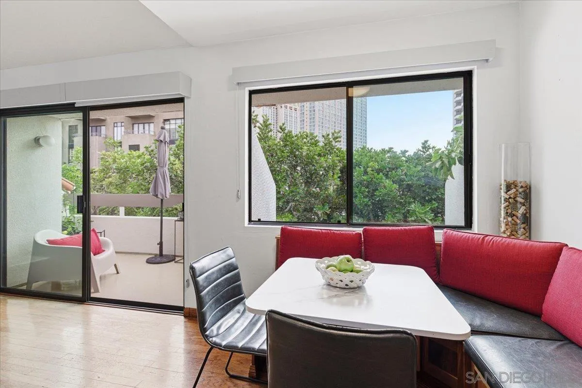 Experience elevated townhome living in the heart of Downtown’s prestigious Marina District within the coveted Park Row community. This exceptional second-story residence welcomes you with rich hardwood floors, soaring ceilings, and an airy open-concept design that blends sophistication with warmth. The expansive living room is illuminated by oversized windows and skylights, while a striking walnut-trimmed fireplace with art tile detailing creates an elegant focal point. A versatile dining area flows seamlessly into the timeless kitchen, thoughtfully appointed with custom black walnut cabinetry, quartz countertops, gas cooking, and refined finishes throughout. Oversized sliding glass doors extend the living space outdoors to a private balcony, where city views stretch toward Seaport Village and the Bay, an ideal setting for effortless indoor-outdoor entertaining. A custom-designed staircase leads to a bright, architectural loft featuring a built-in executive office for two (or bedroom), complete with solid wood desks, extensive bookcases, and integrated storage. A second set of sliding doors opens to an exclusive rooftop deck—perfect for sunset views and starlit evenings above the city. The private primary suite offers a tranquil retreat with a generous jetted soaking tub and a recently remodeled spa-inspired shower. Additional highlights include central air conditioning, in-unit laundry, recessed lighting, and abundant storage.