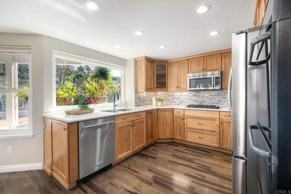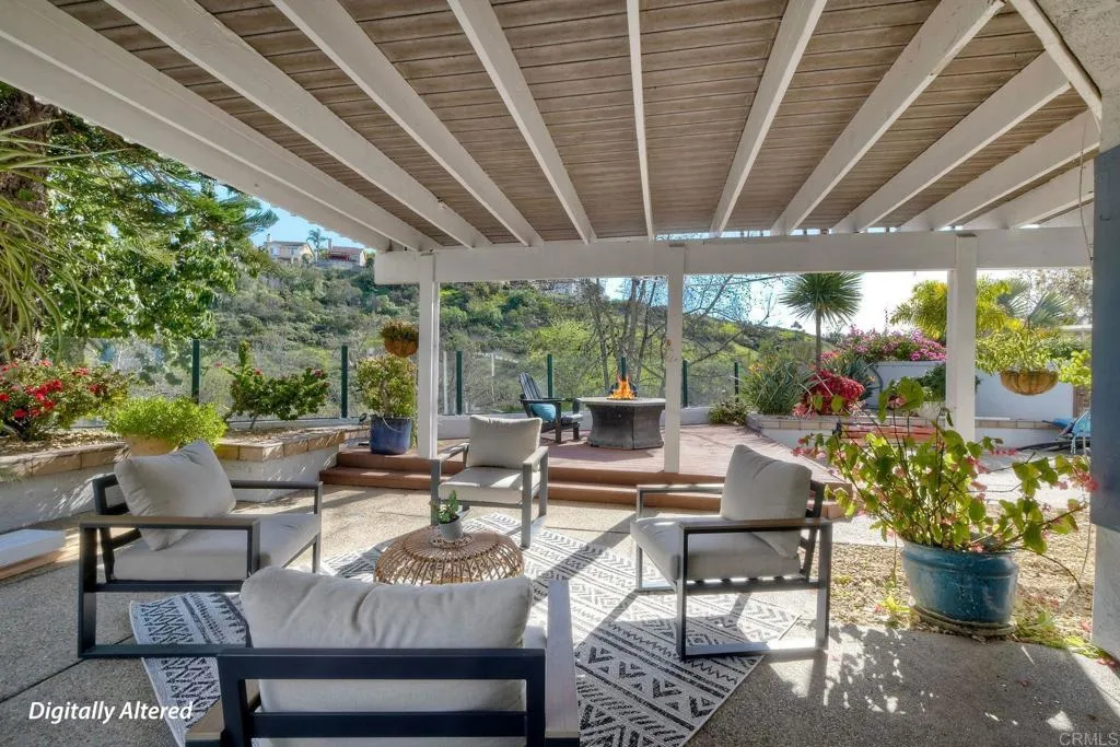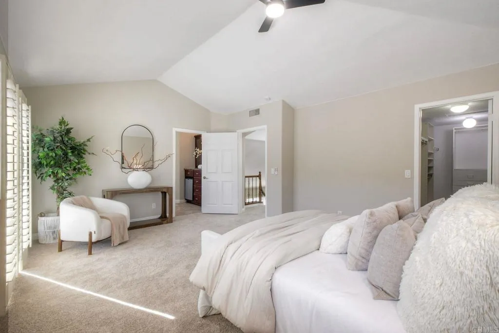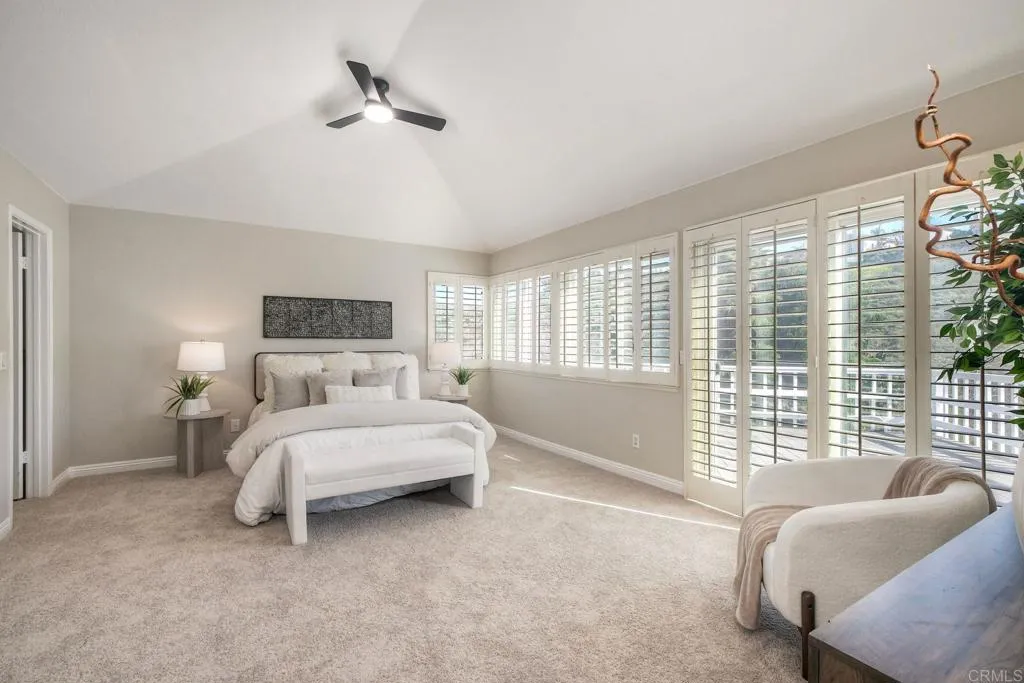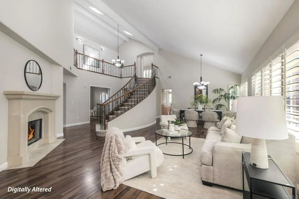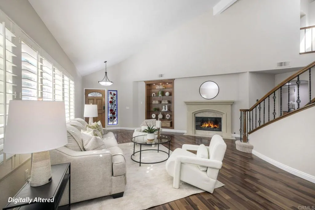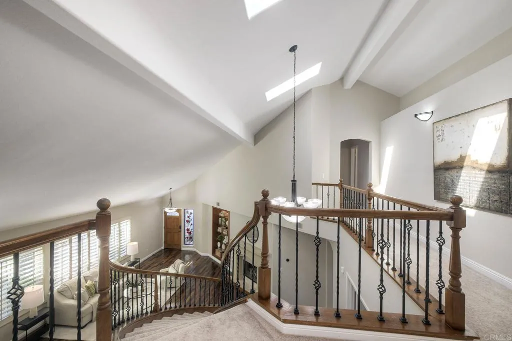 Beautifully upgraded Tierrasanta canyon-view homeoffering privacy, light, and architectural elegance in one of San Diegos most desirable neighborhoods. This4-bedroom, 3-bath residence spans 2,631 sq ft. The home has agrand, open feelhighlighted byvaulted ceilings in the main living room, abundant natural light,two skylights, and a wrought iron staircase and railings. Recent improvements includecomplete interior painting throughout (walls, ceilings, doors, baseboards, and trim),brand-new carpet on the stairs and entire upstairs, andnew fixtures, creating a truly move-in-ready presentation. The thoughtfully designed floor plan offers both openness and functionality, featuringtwo fireplaces, aseparate family room off the remodeled kitchen, and abreakfast nookwith garden views. Adownstairs optional bedroom or office with a full bathprovides excellent flexibility for guests, multigenerational living, or remote work. Remodeled bathrooms, built-ins, and ceiling fans add comfort and style throughout. Upstairs, the expansiveprimary suiteserves as a private retreat with a well-appointed bathroomincluding amini refrigeratorand a sliding door leading to alarge view deck overlooking the canyon. Withno neighbors behind, the setting is peaceful and private, offering scenic canyon views and tranquil outdoor living. Additional highlights include athree-car garage, upgraded laundry room, spacious bedrooms, and a layout that seamlessly balances elegance and livability. This is a rare opportunity to own a beautifully refreshedTierrasanta canyon-view, solar, architectural character, and excepti