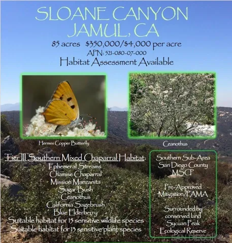 85 acres south of Sloane Canyon Rd surrounded by Sycuan Peak Ecological Reserve. Ideal mitigation and/or conservation land with special status species, hermes copper butterfly, coopers hawk and raptor forgaging. Unbuildable, with no legal or practical access. Habitat Assessment available.